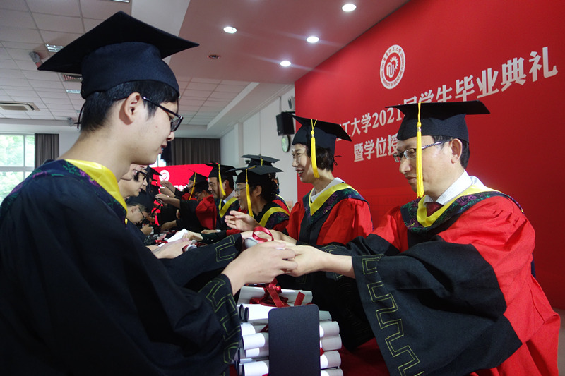 在拨穗正冠环节,校党委副书记、纪委书记沈志超来到学院会场,与学院领导共同为学院本、硕毕业生拨穗正冠,向他们赠送毕业纪念卷轴,并合影留念。典礼在振奋人心的校歌声中落下帷幕。