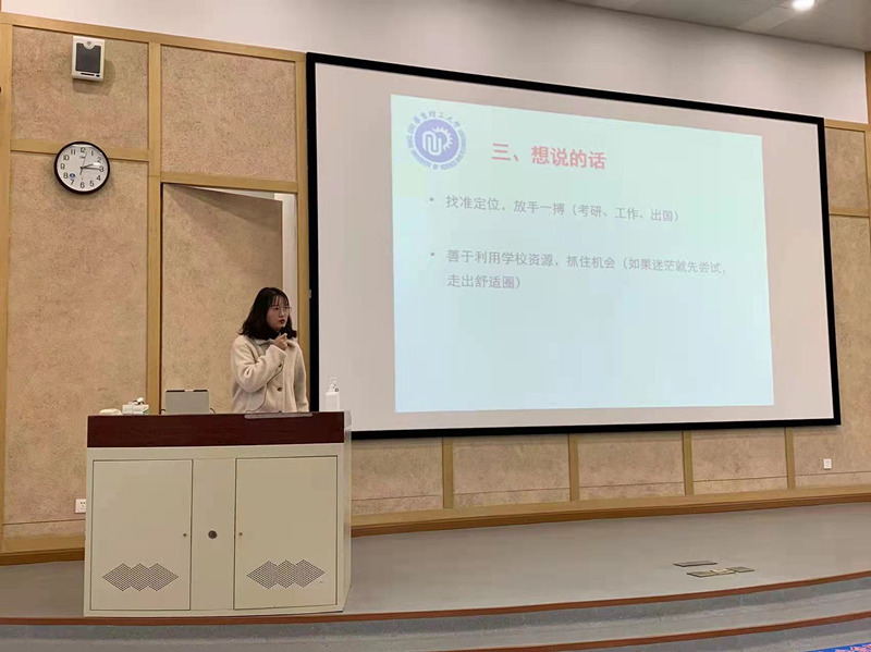 王玉琳通过详细的数据向同学们介绍了学院近两年就业、升学、出国等方面的情况,同时就毕业生三方协议的签订流程进行了详细介绍。她希望同学们要善于利用学校资源,敢于走出舒适圈,抓住机会,努力尝试,争取顺利就业。