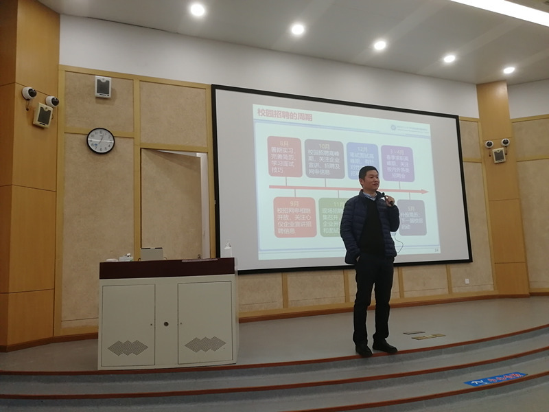 郑东为同学们详细分析了疫情常态化对岗位需求、线下招聘、技能培训的新挑战。他通过就业人数、薪酬水平等数据向同学们介绍了学校往年的整体就业情况,并就常见的毕业去向、签约时间与薪酬水平关系等问题作出了解答。他建议同学们要尽早确定职业目标,拒绝体验式考研,选择职业周期较长的行业,仔细评估职业发展成熟度,把握有限的时间,全力投入到就业工作中去。他强调,今年就业形势有所缓和,只要同学们把握好校招周期,合理利用资源,发现和利用自身优势,就一定能够找到满意的工作。