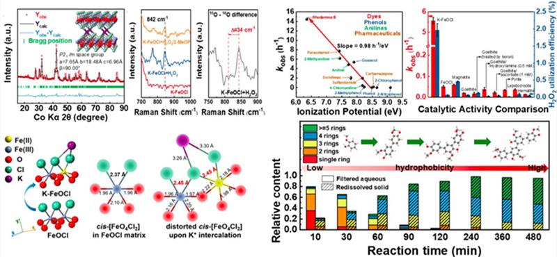 氧氧键活化产生活性氧物种的过程受多相界面金属配位环境影响显著,是生物有氧氧化、自然界氧化还原作用、酶催化和精细选择性氧化的核心微观过程之一。人们利用仿生大环配体,界面金属载体强相互作用,沸石、碳基或硅基骨架限域作用等发展了诸多高效催化氧化体系。2013年我校相关团队发展了FeOCl这一高效多相Fenton催化剂 (J. Am. Chem. Soc. 2013, 135, 43, 16058–16061),高效催化过氧化氢均裂产生羟基自由基。此次,借助FeOCl结构性Cl···Cl范德华层的特殊存在,研究人员通过氧化还原插层,在范德华层间引入碱金属离子,调控FeOCl的铁配位中心微环境,通过插层前体、插层时间等因素的精准优化,在钾离子插层的情况下获得了一种全新的畸变顺式双核FeO4Cl2固相铁配位构型,并通过X射线衍射精修、X射线光电子能谱、穆斯堡尔谱、原位紫外可见光谱、原位拉曼光谱等多种手段在原子尺度解析了上述结构演变过程和新构型下过氧化氢活化路径的切换。过氧化氢异裂产生Fe(IV)=O非自由基活性物种,可诱导染料、药物、酚、胺类多种有机物的氧化偶联腐质化过程,将溶解态有机污染物转变为颗粒絮体,结合过滤可实现有机污染物和总有机碳的高效去除,偶联速率与底物的离子化能存在线性关系。研究团队还通过同位素KIE测试、电子顺磁共振证明了反应过程中涉及底物在K-FeOCl表面的质子耦合电子转移和液相主体中的自由基偶联过程。