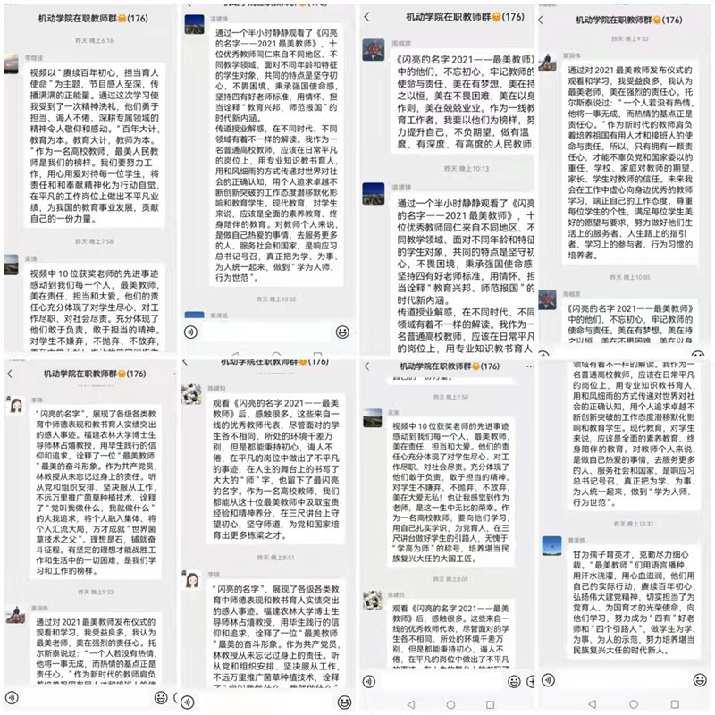会后,学院教职工在微信群里展开了热烈的讨论,纷纷发表了学习感想,大家一致表示,要努力成为“四有”好老师和“四个引路人”,做学生为学、为事、为人的示范,努力培养堪当民族复兴大任的时代新人。学院历来高度重视教职工理论学习,坚持把理论学习摆在重要位置,将其作为筑牢教职工理想信念、凝聚强大精神力量、研究拓宽工作思路、推动工作创新发展的一项基础性工作抓细抓实,此次学习达到了凝聚思想、深化认识、推动工作的目的。