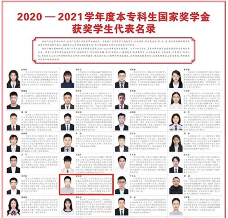 5月4日,《人民日报》刊登《2020-2021学年度本专科生国家奖学金获奖学生代表名录》,我校太阳集团城娱8722机械设计制造及其自动化专业2018级本科生张钰炯从6万名本专科国家奖学金获奖学生中脱颖而出,作为全国100名优秀学生代表荣登该名录。