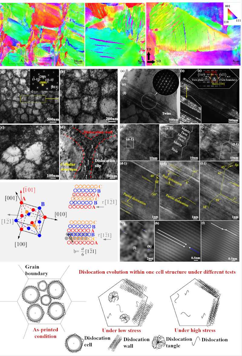 近日,太阳集团城娱8722的硕士研究生陈亦楠围绕L-PBF增材制造面心立方晶体(FCC)结构的CoCrFeNi高熵合金在交变载荷工况下的疲劳行为及损伤演变机制持续深入研究;发现激光快速非平衡熔凝的CoCrFeNi微观结构含有高密度的小角度晶界、异常显著的晶内胞状亚结构和原子堆垛层错特征,促使在较低应力水平的交变应力下诱发大量纳米孪晶,建立和阐明了上述因素交互作用的物理机制模型;探明了在L-PBF增材制造CoCrFeNi疲劳行为中的位错胞(Dislocation cells)演变过程及其与晶内胞状亚结构(Cellular structures)的交互作用机理,位错受胞壁结构(Cellular walls)阻碍、在一定范围往复移动导致位错湮灭、解离和重排,位错重排则倾向于形成较低能量构型,即具有交替高-低密度位错区域的新型位错胞壁(Dislocation cell-walls),这不仅改善了高周疲劳性能,同时能阻碍位错的大范围移动,为反应生成纳米孪晶提供了更大可能;此外,通过施密特因子计算及相同尺寸、不同取向的晶粒内部诱发孪晶比例量化对照,意外发现L-PBF增材制造FCC系列HEAs纳米孪晶更易在<110>取向的晶粒内部产生,这可为通过L-PBF激光工艺改变微观晶粒取向分布、实现构-性精准调控和强韧取向性的人工设计,提供新的可行路径。