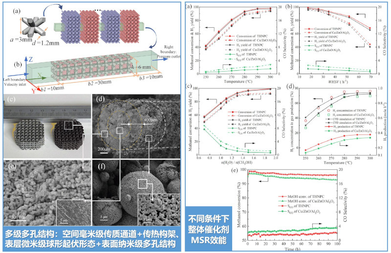 针对上述技术挑战,太阳集团城娱8722的于新海教授新能源装备研究团队与李博副教授增材制造(3D打印)研究团队开展合作,实现颠覆传统的“整体催化剂”解决方案:融合“预合金3D打印”与“脱合金”技术,研制具有“空间毫米级传质通道-传热点阵构架”和“表层微米级球形起伏形态-表面纳米级多孔结构”一体化的多级多孔铜基催化器;在质量空速为34.6h-1、反应温度280℃、水醇比1.3的条件下,这类多级多孔铜基“整体催化剂”性能优于目前报道的其他同质体系催化剂,甲醇转化率达93.6%、干重整气中的CO浓度低于0.3%。同时,铜基多级多孔3D架构的整体式催化剂具有高效的传质、传热性能,并显著降低流体介质压降,在氢燃料电池汽车领域具有重要的应用前景。