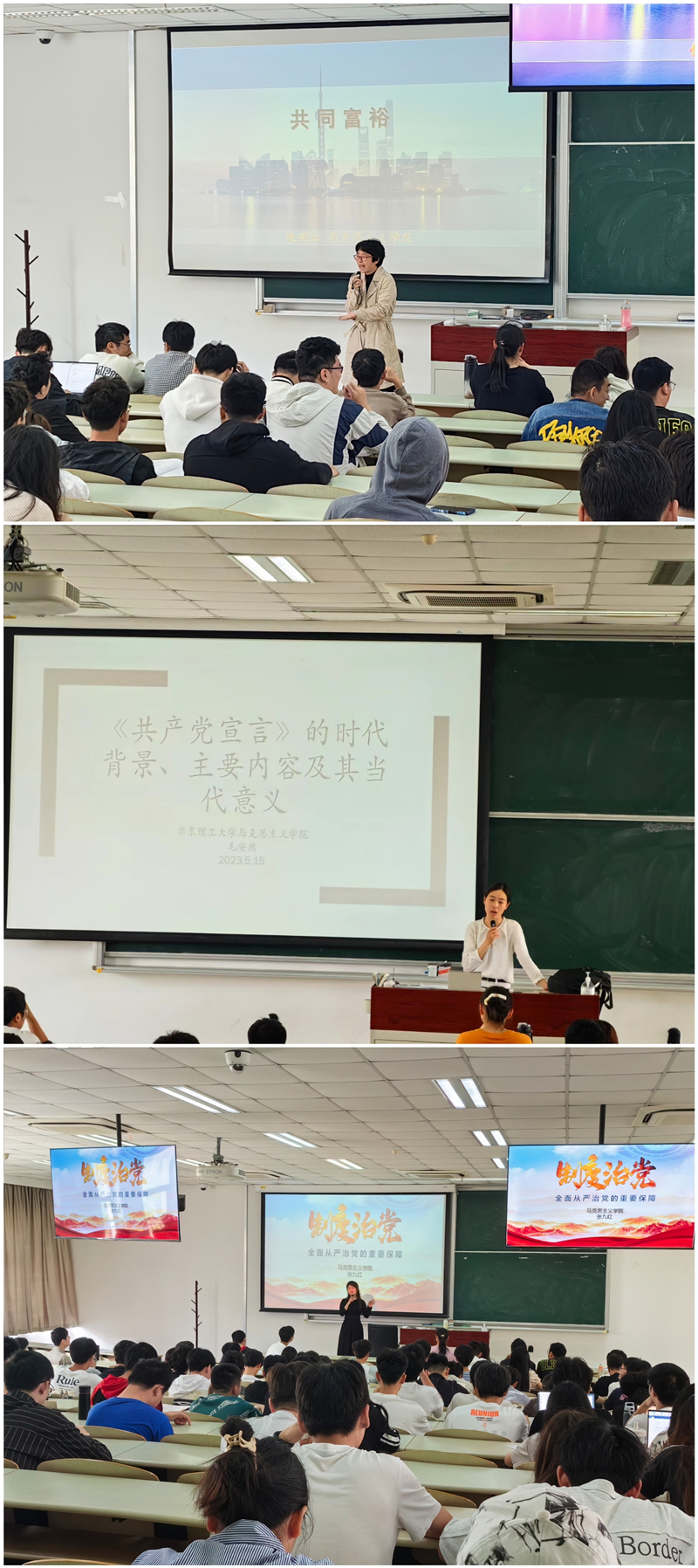 倪明红老师的党课主题为“共同富裕”,她介绍了共同富裕的内涵以及本质概念,结合现实案例生动诠释如何实现共同富裕的行动路径。毛安然老师从马克思生平经历说起,介绍了《共产党宣言》的时代背景、主要内容和当代意义,并阐述了何为马克思主义中国化,鼓励同学们遇到实际问题要具体问题具体分析。张九红老师以“制度治党——全面从严治党的重要保障”为主题,分别从“治党事关长远”和“标本兼治建章立制”两个方面阐述制度治党的历史背景和应有之义。三位老师从理论到实践,由浅入深多维度地向同学们介绍党的理论知识,帮助积极分子们进一步提升党性,加深对中国共产党的理解。