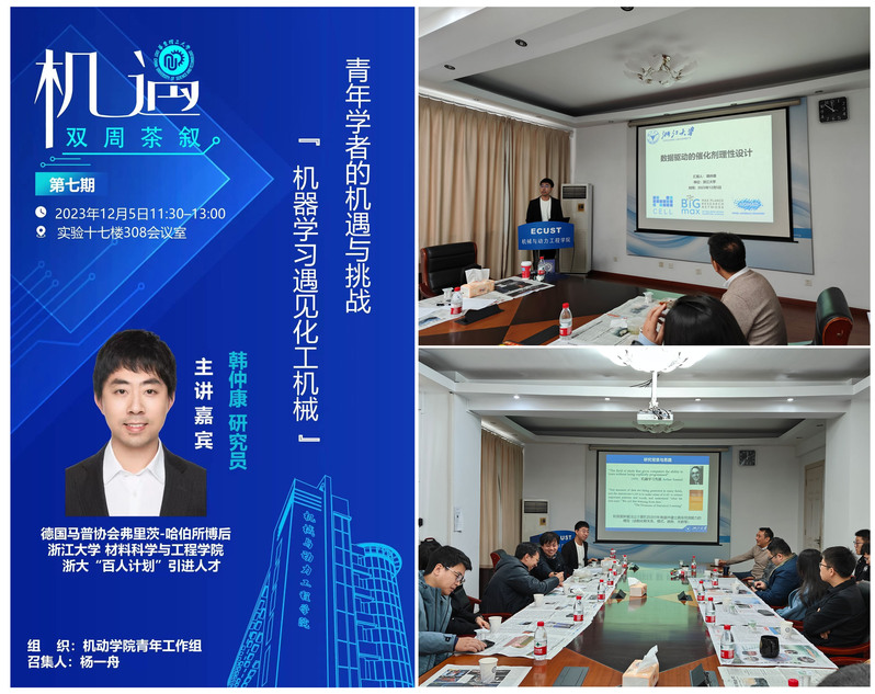 12月5日,我院青年教师杨一舟等作为召集人组织开展的“机·遇 双周茶叙”系列青年成长沙龙(第七期)在徐汇校区举行。浙江大学材料科学与工程学院博士生导师、“百人计划”引进人才韩仲康研究员以“机器学习遇见化工机械:青年学者的机遇与挑战”为题进行主题分享。学院30余名师生参加活动。