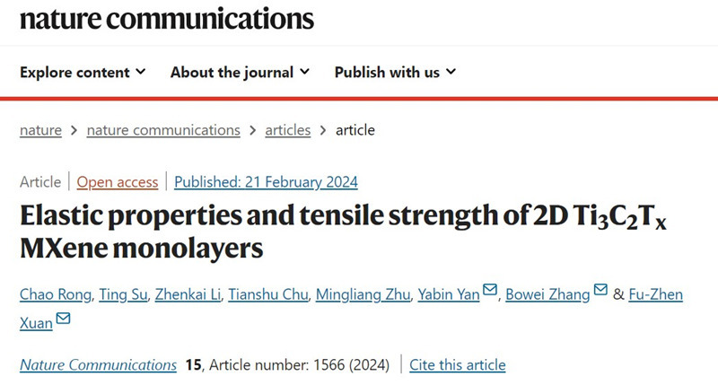 近日,我校太阳集团城娱8722张博威等在Nature Communications 上发表了题为 “Elastic properties and tensile strength of 2D Ti3C2Tx MXene monolayers” 的研究论文,在线报道了该课题组在Ti3C2Tx基柔性传感材料结构强度领域的研究进展,提出一种可靠、直接、定量的方法来测量单层Ti3C2Tx纳米片的力学性能。
