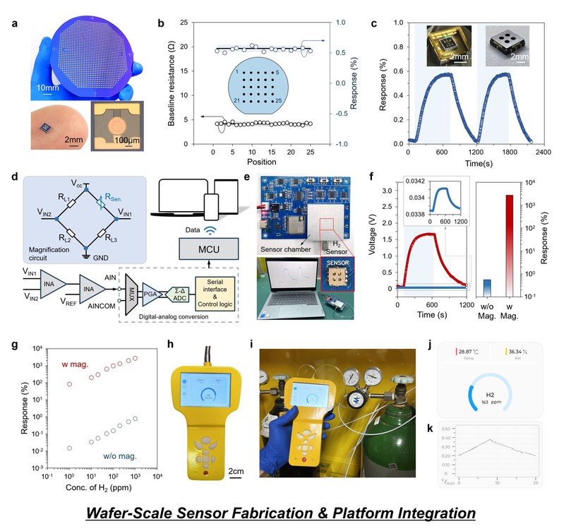 此外,研究团队进一步实现了该悬浮结构氢气传感器从实验室原型向晶圆级器件制造的平稳转化,验证了其良好的工艺兼容性与规模化制备潜力。基于标准微纳加工工艺,传感器可在4寸晶圆上实现一致性制备,并成功集成至便携式检测平台,用于氢气泄漏的实时监测与预警。这一成果表明,所提出的SAM界面应力工程方法不仅在基础研究层面具有重要意义,也在工程应用层面具备明确可行性。该方法突破了传统Pd基氢气传感器在高浓度和长时间工作条件下易失效的稳定性瓶颈,为构建高性能、高可靠、可规模化生产的分子与气体传感器提供了通用设计思路,有望推动氢气传感技术向规模化、实用化和系统化方向加速发展。