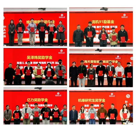 颁奖环节,姜颖、蔡晓卫、吴清、李煜佳副书记、陈建钧副院长和朱明亮副院长分别为2025年度 “维科精密奖助学金”、“吴泽炜奖助学金”、“流机91励基金”、“亿力奖助学金”、“东海天普智能发展奖助学金” 和“机缘研究生奖学金”的获奖学生颁发证书。每一份证书都承载着捐赠方对学生成长成才的期许与鼓励。